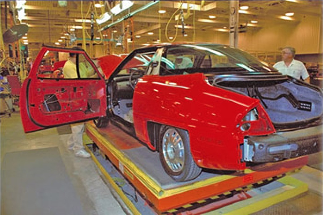 1996 Space Frame exiting one of two (2) ovens GM used to cure the Ciba-Geigy bonding adhesive. The red areas are the front strut towers which are riveted to the to the lower frame rails and bonded and riveted to the outer rails. The blue areas protruding below the strut towers are the front bumper mounting brackets and the center blue area is the lower cross member which supports the cradle and front motor mount.